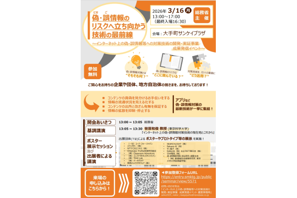 総務省は、インターネット上の偽・誤情報の流通・拡散リスクへの対策に資する技術の開発・実証事業の成果を発信するイベント「偽・誤情報のリスクへ立ち向かう技術の最前線」を3月16日、東京・大手町の大手町サンケイプラザで開催する。