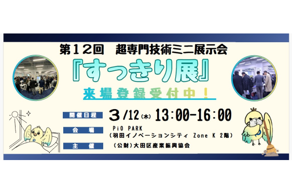 大田区産業振興協会は、高度なものづくり技術に特化した「超専門技術ミニ展示会」シリーズ第12弾として、浄化・純化・美化・整理整頓をテーマにした「すっきり展」を3月12日に東京都大田区の羽田イノベーションシティ「PiO PARK」で開催する。