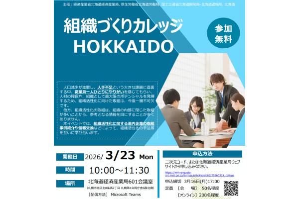 北海道経済産業局は、北海道労働局、北海道開発局、北海道運輸局、北海道とともに、組織活性化のあり方や取り組みを考え、学び合うための官民合同イベント「組織づくりカレッジHOKKAIDO」を、リアルとオンラインのハイブリッド型で開催する。