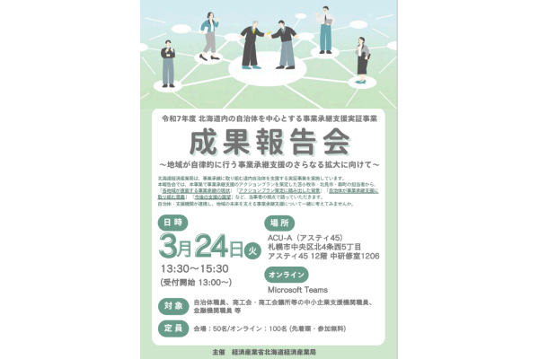 北海道経済産業局は、北海道内の自治体を中心とする事業承継支援実証事業の取り組みに関する成果報告会を、リアルとオンラインのハイブリッド形式で開催する。