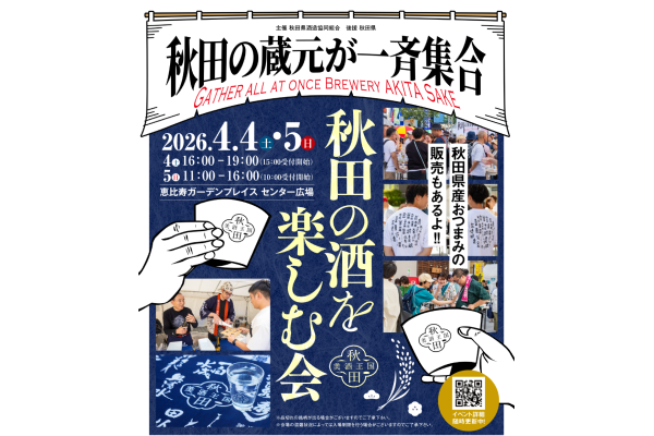 秋田県酒造協同組合は、「秋田の酒を楽しむ会in東京」を4月4、5日に東京都渋谷区の恵比寿ガーデンプレイスのセンター広場で開催する。