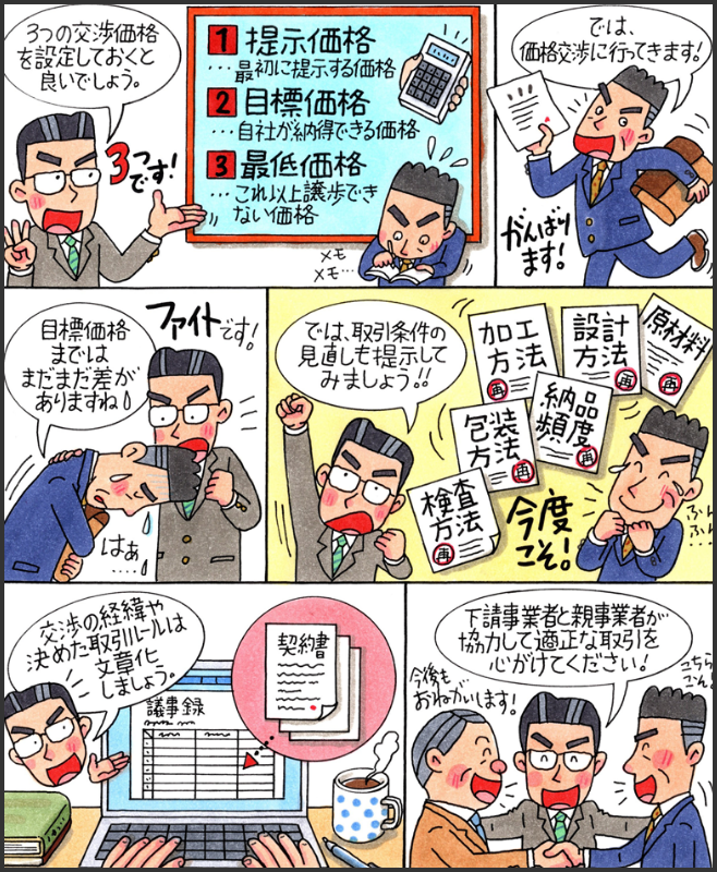 今回のマンガでわかるシリーズでは、売り手である「下請事業者」が、買い手である「親事業者」に、価格交渉を行うためのテクニックやポイントについてご紹介します。