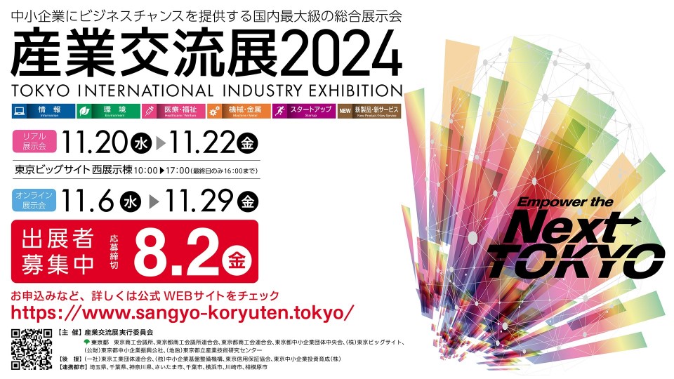 産業交流展は東京都などで組織する実行委員会の主催で、首都圏の個性豊かな中小企業の優れた製品や技術を一堂に展示する国内最大級の見本市。リアル開催は東京ビッグサイト(東京都江東区)を会場に11月20~22日、オンライン開催は11月6~29日となっている。出展対象は、首都圏(東京都・埼玉県・千葉県・神奈川県)に事業所を有し、情報、環境、医療・福祉、機械・金属のいずれかの分野に属する中小企業・団体など。
