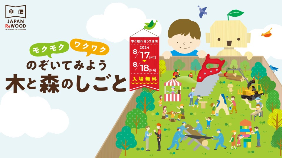 東京都とWOODコレクション実行委員会は、国産木材に特化した展示商談会WOODコレクション2024「JAPAN ReWOOD」を8月17、18日に東京都江東区の東京ビッグサイト南1・2ホールとシンボルプロムナード公園内の花の広場・石と光の広場で開催する。入場無料。