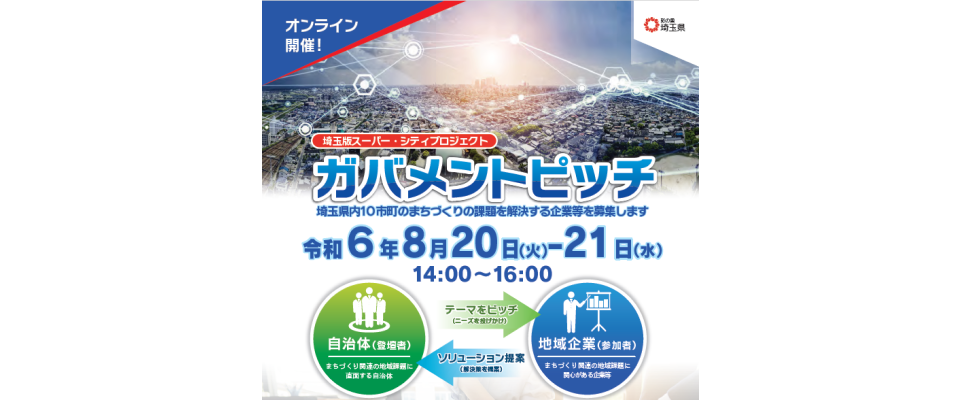 埼玉県は、県内10市町のまちづくりの課題解決に向けた「埼玉版スーパー・シティプロジェクトガバメントピッチ」を8月20、21日にオンラインで開催することとし、参加する企業や団体、研究機関などを募集している。参加無料。