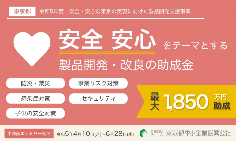 東京都中小企業振興公社は、防災・減災や感染症対策など安全・安心がテーマの製品開発などに経費の一部を助成する。助成は3区分あり、全区分で助成を受けた場合、最大1850万円となる。申請にあたっては6月28日までに申請前エントリーを行ったうえで6月29日〜7月7日に申請することとなる。