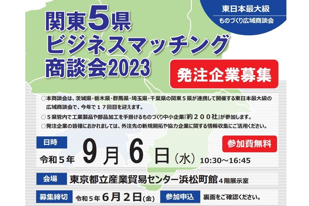 関東5県(茨城県、栃木県、群馬県、埼玉県、千葉県)の中小企業支援機関は、9月6日に東京都立産業貿易センター浜松町館(東京都港区)で開催される「関東5県ビジネスマッチング商談会2023」に参加する発注企業を全国から募集している。参加無料。募集数は80社程度。申し込み期限は6月2日。