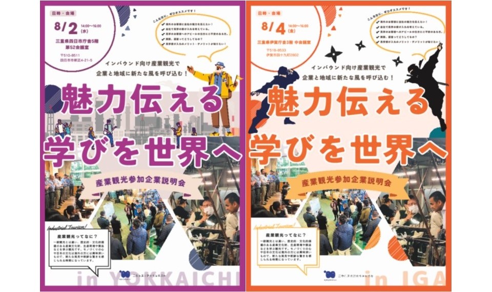 三重県は、県の産業観光に関する説明会を8月中に県内4カ所(四日市市、伊賀市、松阪市、尾鷲市)で開催する。対象は、県内の事業者(製造業や建設業、サービス業など業種を問わない)、商工団体、市町。参加無料。
