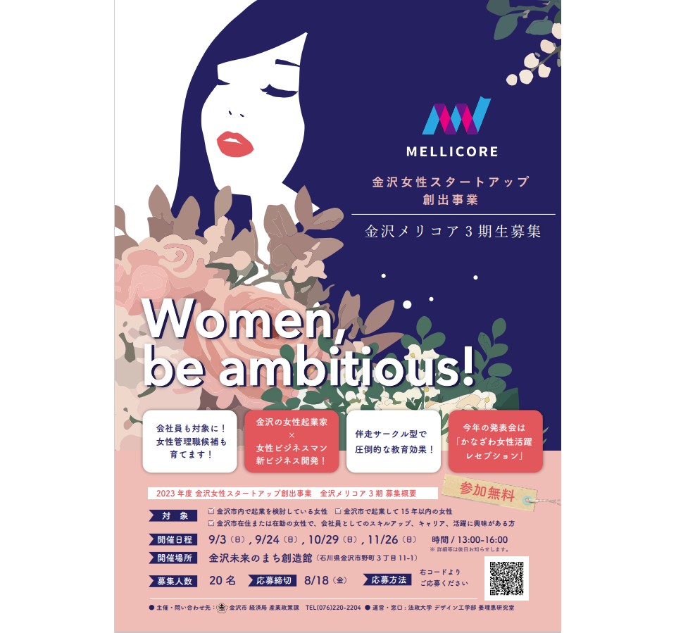 対象は金沢市内で起業を検討している女性、金沢市で起業して15 年以内の女性、金沢市在住または在勤の女性で、会社員としてのスキルアップ、キャリア、活躍に興味がある人。
