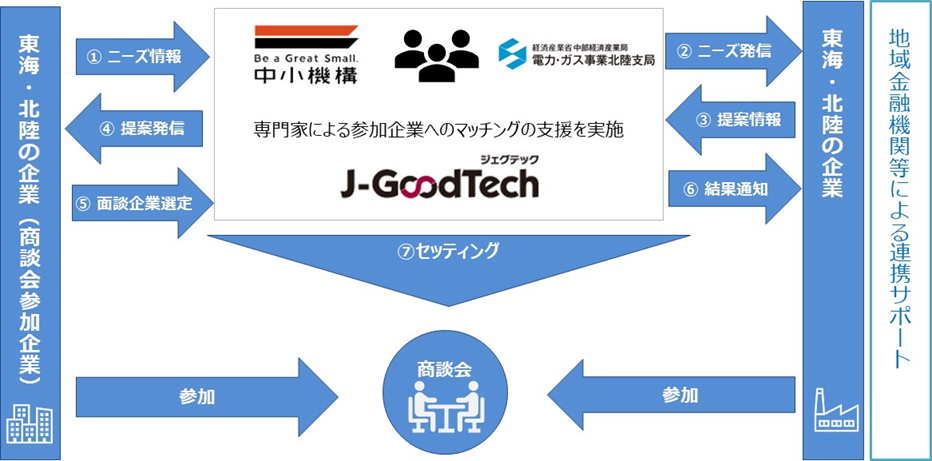 商談に参加できるのは北陸地域(富山県、石川県、福井県)と東海地域(愛知県、岐阜県、三重県)に拠点を持つ企業。商談会に参加するには、中小機構が運営するマッチングサイト「J-GoodTech(ジェグテック)」に登録する必要があり、公開されているニーズの中で関心がある案件についてジェグテックを通じて申し込む。申し込んだ提案はニーズ発信企業に紹介され、内容などに応じて商談が設定される。