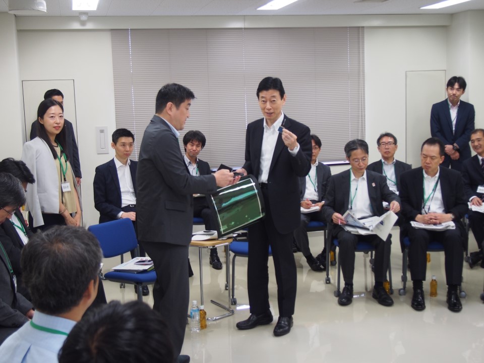 その後、クリエイション・コア京都御車の入居企業や京都のスタートアップ企業の経営者8人とベンチャーキャピタル経営者らと車座懇談を行った。iHeart Japan株式会社の角田健治社長は「iPS細胞から分化させた心臓や血管などの細胞を培養することで、心臓移植をする必要のない世界を目指している」と説明した。リージョナルフィッシュ株式会社の梅川忠典社長は「ゲノム編集技術で魚の品種改良に取り組んでいる」と紹介するなど、各社の代表が事業にかける思いを語った。
