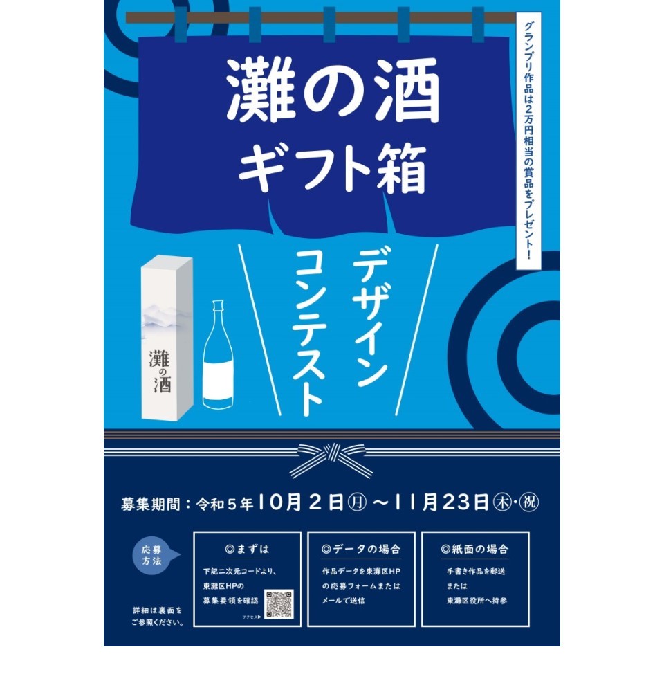 神戸市東灘区は地場産業である「灘の酒」の魅力をより多くの方に知ってもらうため、ギフト箱(化粧箱)のデザインコンテストを開催する。グランプリ作品は、実際にそのデザインで箱を作り、酒造メーカーのショップで使用する。
