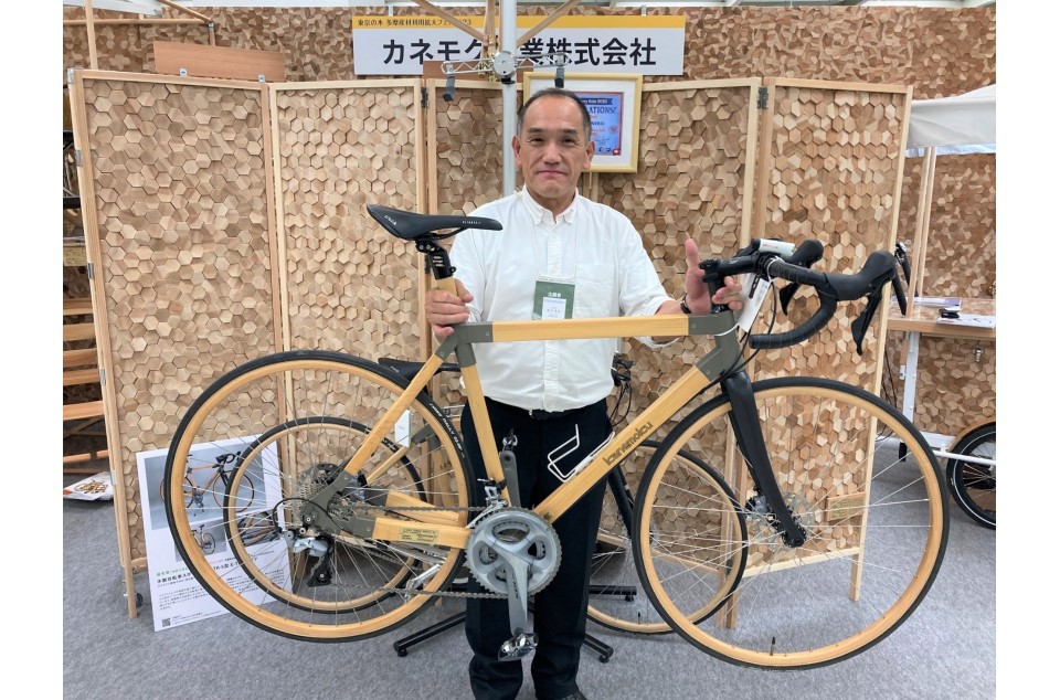 フレームに東京の木を使った自転車をPRするカネモク工業の金子克彦代表取締役