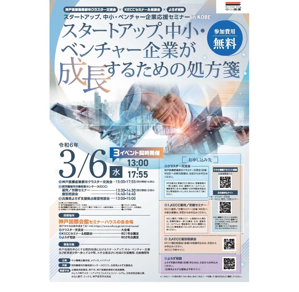 中小機構近畿本部は、関西圏雇用労働相談センター(KECC)、兵庫県よろず支援拠点と連携したスタートアップ向けセミナー・相談会「スタートアップ、中小・ベンチャー企業が成長するための処方箋」を3月6日に神戸国際会館セミナーハウス(神戸市中央区)で開催する。オンラインでも同時開催。参加無料。定員は会場100人、オンライン200人。参加申し込みは3月4日まで。