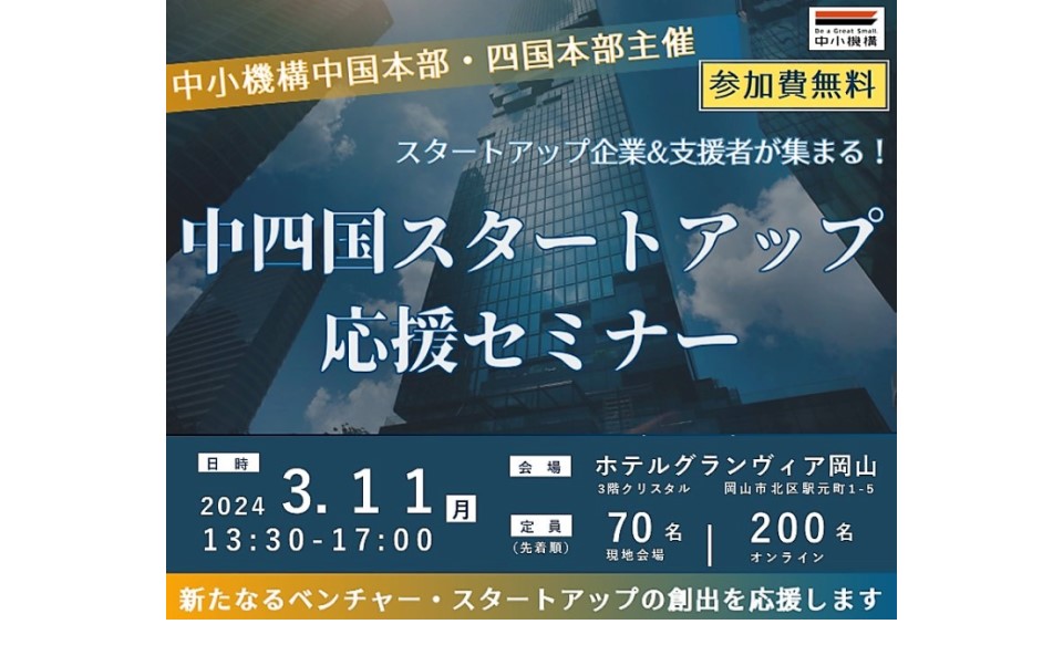 中小機構中国本部と四国本部は、中四国地域でのベンチャー・スタートアップ支援者のネットワーク強化を図ることを目的に「中四国スタートアップ応援セミナー」を3月11日、岡山市北区のホテルグランヴィア岡山で開催する。スタートアップ支援機関や金融機関、その他支援機関職員、ベンチャー・スタートアップ、経営者などを対象に2月15日に参加の受け付けを開始した。