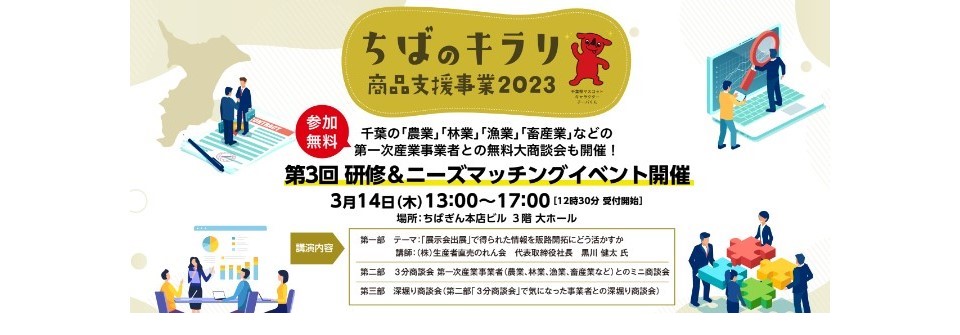 千葉県は、県内事業者を対象に「令和5年度ちばのキラリ商品支援事業第3回研修&ニーズマッチングイベント」を3月14日にちばぎん本店ビル大ホール(千葉市中央区)で開催する。参加無料。今回は第一次産業の事業者を中心とした商談会や今年度中に事業者同士のマッチングで開発した商品展示などが行われる。申し込み締め切りは3月7日。