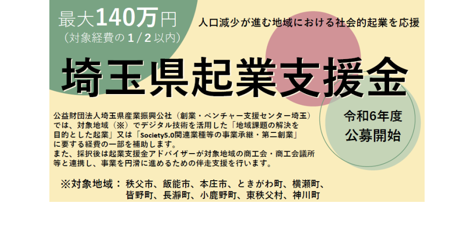 人口減少が進む地域での社会的起業に最大140万円:埼玉県産業振興公社