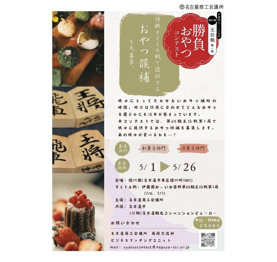 名古屋商工会議所は、名古屋市などとの共催で、将棋タイトル戦・第65期王位戦第1局で棋士に提供する「おやつ候補リスト」に掲載する「おやつ」(和菓子・洋菓子)を選定するコンテストを実施する。応募締め切りは5月26日。書類審査で20品程度を選出したうえでウェブ投票と審査員投票を行い、6月17日に8品程度の候補リストを公表する。