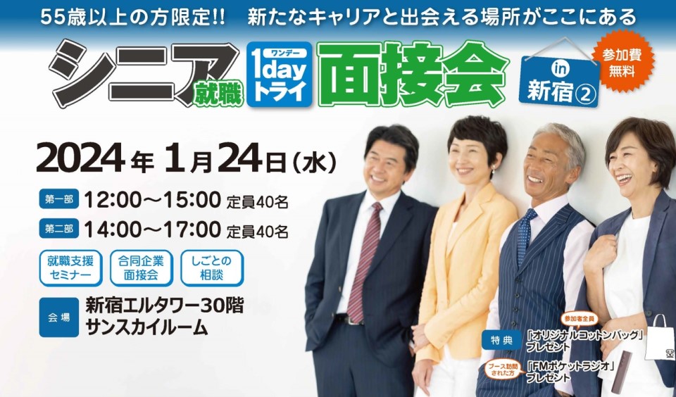東京しごと財団は、東京都内での就業を希望する55歳以上のシニアの就職・再就職の支援するマッチングイベント「シニア就職1dayトライ面接会in新宿(2)」を2024年1月24日に新宿エルタワー(東京都新宿区)で開催することとし、求職者の参加申し込みを受け付けている。参加無料。イベント前日までに東京しごとセンターへの登録が必要。