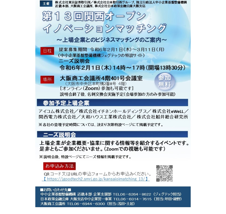 中小機構近畿本部は、株式会社東京証券取引所、株式会社日本政策金融公庫大阪支店、大阪商工会議所と共催で、近畿圏の上場企業と中小企業とのビジネスマッチングを支援することを目的に、「第13回関西オープンイノベーション・マッチング」を開催する。