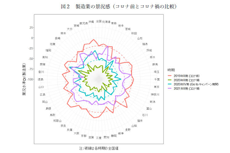 図2では、コロナ前の2019年II期(赤色)、DI値が底になった2020年のII期(黄緑色)、直近の2021年のII期(紫色)を観察する。同四半期を比較することでDI値の季節性の除去ができる。これらに2020年IV期(水色)を加えることでGo To キャンペーン時期の産業と地域への影響も見ることができる。