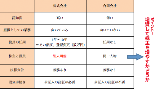 将来増資して株主を増やしていく予定がある場合には、合同会社は相応しくなく、株式会社を選択しておく必要があります。