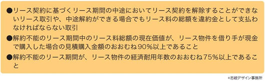 ファイナンス・リース取引とは、下記の要件を充たすリース取引のことをいいます。