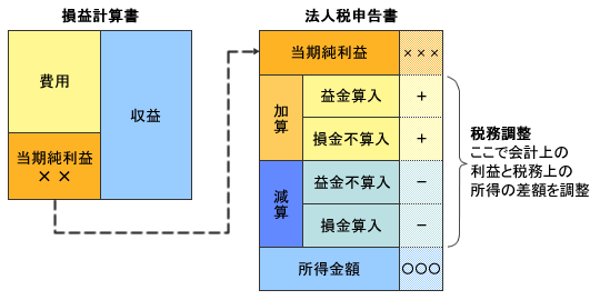 法人税の所得金額は、企業会計上の利益に「益金算入・損金不算入」の項目(加算項目)を加算し、「益金不算入・損金算入」の項目(減算項目)を減算して計算されます。