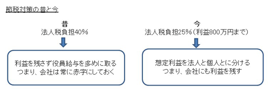 例えば役員給与の金額を少なくすれば、会社に利益が残り法人税が課税されます。役員給与には所得税、住民税が課税され、さらに社会保険料の負担が会社と個人の両方にあります。法人税の実効税率が利益800万円までは25%くらいのため、役員給与を少なくすることで所得税、住民税、社会保険の負担を減らし、会社に利益を残して法人税を納税するというような節税方法が行われるようになりました。
