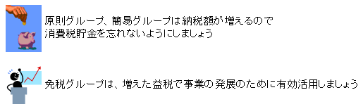 事業者は消費税の負担はしませんが、納税をします。そのため、消費税納税のための資金繰りには細心の注意を払うようにして下さい。消費税貯金はとても大事です。簡易グループは、益税が増えることが予想されますが、原則グループと同じように納税額は増えますので、消費税貯金を忘れないで下さい。そして、免税グループに属している人は、増税により得をするグループです。増えた益税は事業の発展のために有効的に使用しましょう。