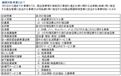 経営改善設備投資減税は、設備投資を行う事業を以下の事業に限定しています。ほとんどの業種が該当すると思いますが、建設業や製造業は対象から除かれています。建設業を行う企業が小売業も行っている場合には、小売業に対する設備投資であれば減税の対象となります。
