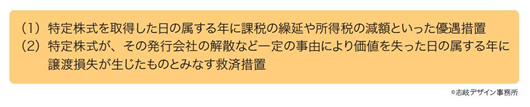 (2)の救済措置は、投資対象会社の倒産などの損失をその株式の譲渡損失とみなして、他の株式の売却益から控除できるという制度です。現行の所得税法においては、保有株式を売却することによってその損失が実現した場合以外には、株式等に係る譲渡所得等の金額の計算において、他の株式の売却益と相殺することはできません。しかし、この救済措置により、特定株式については株式公開前までにその会社の解散などの事由により株式としての価値を失った場合には、その特定株式を譲渡して損失が発生したものとみなして、田の株式の売却益と相殺することが可能となり、相殺しきれない損失については最長で翌年以後3年間に渡り繰り越して、株式等に係る譲渡所得等の金額から控除することができます。