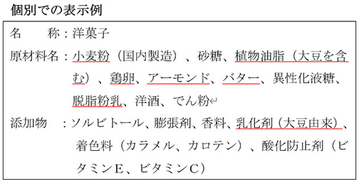 個々の原材料や添加物ごとに、アレルゲンを表示する方法です。(~を含む)等と表示