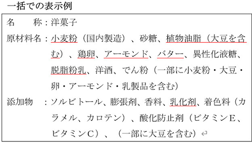 加工食品に使われているアレルゲンを、原材料名等の最後にまとめて表示する方法