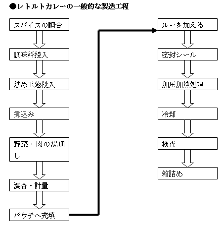 以下にレトルト食品の代表的な製品であるレトルトカレーの一般的な製造工程を紹介します。