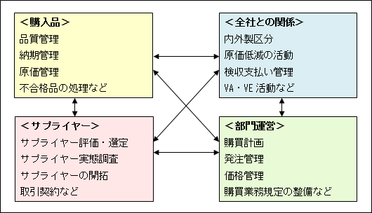 以上が購買管理の定義となりますが、購買管理にはさまざまな機能があります。この機能を大別すると「全社活動に関係する機能」「購買部門の部門運営に関係する機能」「購入品に関係する機能」「サプライヤーに関係する機能」の4つに分けることができ、その中には下図のような機能が含まれます。これらの機能を効率的に結合させることで企業利益の創造に貢献することができます。