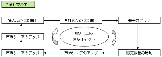「企業利益の向上」とは、購入品のQCD向上による波及サイクルを回して企業利益を向上させることです。購入品のQCDが向上することにより、自社製品のQCDを向上させ市場における競争力をアップさせます。そして販売数量が増加し、市場シェアもアップして企業利益が向上市経営目的達成に貢献できます。