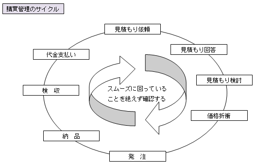 購入依頼を受けた購買部門は、適切なサプライヤーを選定し、見積もりを依頼します。そして見積もり回答を集約して価格を折衝し、サプライヤーを絞り込みます。その後納品された品物を検収して代金を支払います。この流れが購買管理のサイクルとなります。