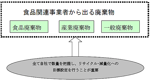 食品を取り扱う事業者(食品の製造・加工業者、卸売・小売業者、飲食店等)は、食品の製造から廃棄の各段階で、食品廃棄物等の発生抑制・減量と食品循環資源の有効活用を図り、環境負荷の少ない社会の構築に貢献することが重要です。