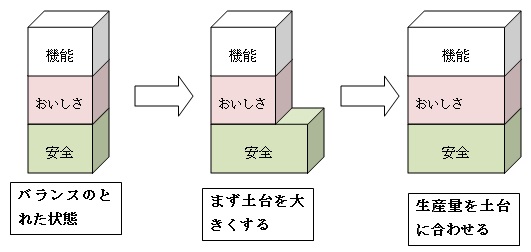 安全という土台をしっかりすることによって、食品の持つおいしさや機能が発揮されるのです。この土台である安全はあまり大きくする必要はなく、しっかりさせておくことが重要です。生産量を拡大する時などは、安全を確保してから拡大することが肝要になるのです。