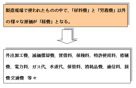 「経費」は種々の費用の集合です。製品の製造に直結した「外注加工費」「設計料」、また工場の建設や設備に関する「減価償却費」「賃借料」なども該当します。材料の燃料費となる「電力料」「ガス代」も経費となります。また、製造現場で使われた「通信費」「旅費交通費」も経費です。