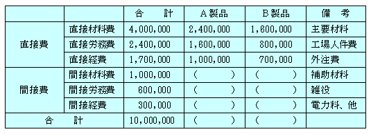 直接製造に携わった人の賃金は240万円、雑役係の人の賃金は60万円でした。直接製造に携わった人はA製品の製造に800時間、B製品の製造に400時間をかけていました。