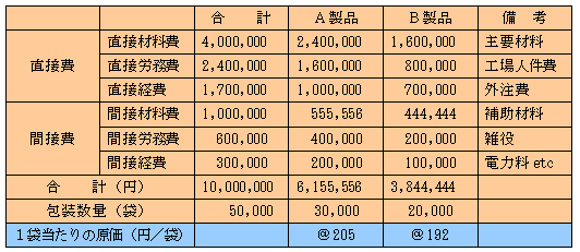 上述の数値を表に当てはめ、製品の包装数量(この場合はA製品が3万袋、B製品が2万袋とします)で割ると1袋当たりのコストが計算できます。
