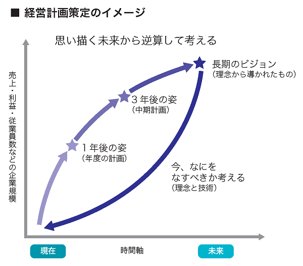 また、1回目から優れた経営計画書ができるとも考えないほうがいい。実際に運用し、外部要因なども加味しながら、必要に応じて目標を修正していく必要がある。何年にもわたって書き換えていくことで、初めて書いてあることが浸透し、社風になっていく。その意味では、期間や粒度に悩んでいるなら、まず長期のビジョンを描き(図参照)、3年先の目標を設定した中期経営計画を作成。それを1年単位の行動計画に落とし込んでいくのがいいだろう。