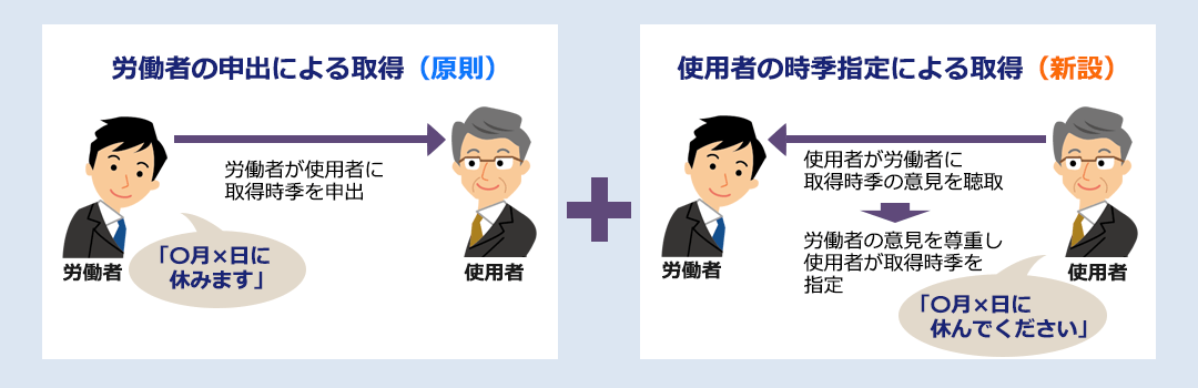 年休は、働く人が請求するのが本来の取得方法ですが、職場の雰囲気を気遣って年休を「遠慮」するような"日本的な事情"もあり、本来の方法だけでは取得が進みません。今回の改正法は、こうした事情も踏まえて、使用者が年5日に限って時季指定するという方法を新設したといえます。