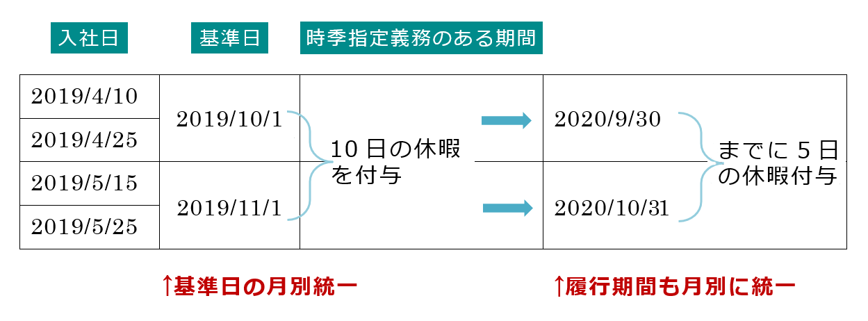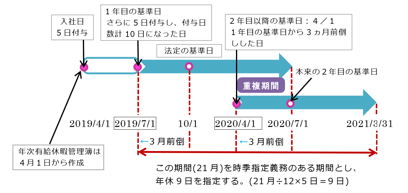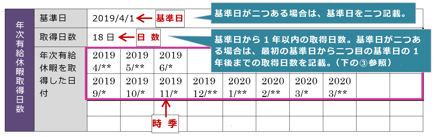 ① 「法定の年次有給休暇日数が10日以上」とは、改正法の施行日である2019年4月1日以後に新たに付与された年休が10日以上、ということです。2019年3月31日以前に付与された年休は、10日以上あっても時季指定の対象にはなりません。