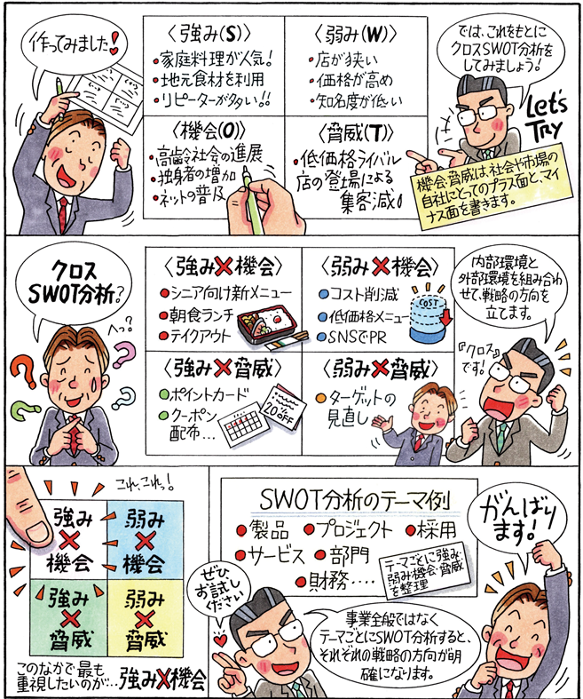 たとえば、新製品の開発にあたっては「製品」の強み・弱み・機会・脅威を分析したり、採用活動が上手くいかない時には「採用」をテーマにして採用戦略を立てたりすることも良い方法です。