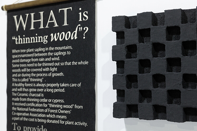 「香りを残して嫌なニオイを脱臭する機能に着目して、どう付加価値をつけるかを試行錯誤しました。そこで持ち上がったのが静岡のヒノキを活用した地域資源活用計画でした。単なる建材という域を超え、デザイナーやプランナーと一緒に脱臭&ヒノキのアロマによる空気清浄器『アルーマ』を開発したのです」。それ以降、セラミック炭の脱臭&調湿機能を生かした新しいプロダクトを次々と開発し、2002年から毎年連続でギフト・ショーに出展。販路を全く持たない状況から、インテリアや雑貨業界へ着々と販路を拡大した。