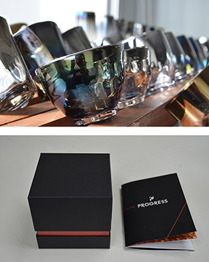 その後も、自社ブランドの構築を目指してroomsや素材展、Magicなど多様なカテゴリーの展示会へ出展し、多様な形状や素材にチタンコーディングを施したプロトタイプを使ってプレゼンテーションを行う。そこで特に商品化の要望が高かったグラスを、ライフスタイルの細部まで確立されたペルソナを想定してブランディングし、高級路線の〈PROGRESS〉として開発。国内展示会への出展などを通して、発売からわずか3年ほどで順調に販路を拡大し、実に売上の7、8割を占めるほど急速な成長を遂げた。