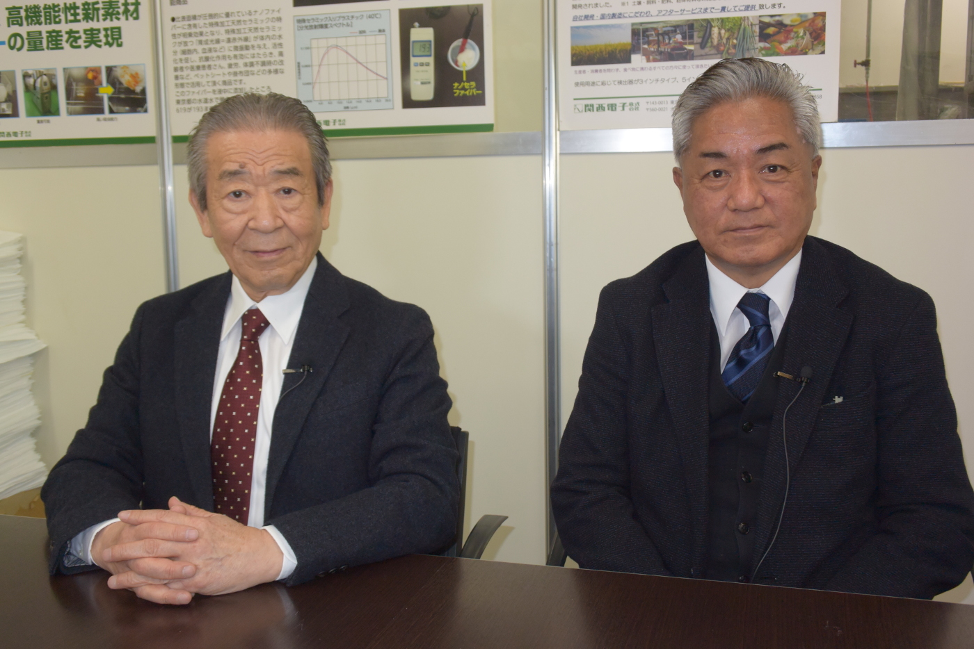 「ナノファイバー」は、その多様な特性が世界的にも注目を集める新素材です。しかし、これまでは量産できないという課題がありました。この課題を解決する量産型ナノファイバー溶融紡糸装置を開発し、事業化に成功したのが「関西電子株式会社」です。この素材の幅広い分野への展開をパートナー企業とともに進めたいとする同社の代表取締役 社長・進士国広氏(写真左)と、取締役・近藤正博氏(写真右)の二人にお話を伺いました。